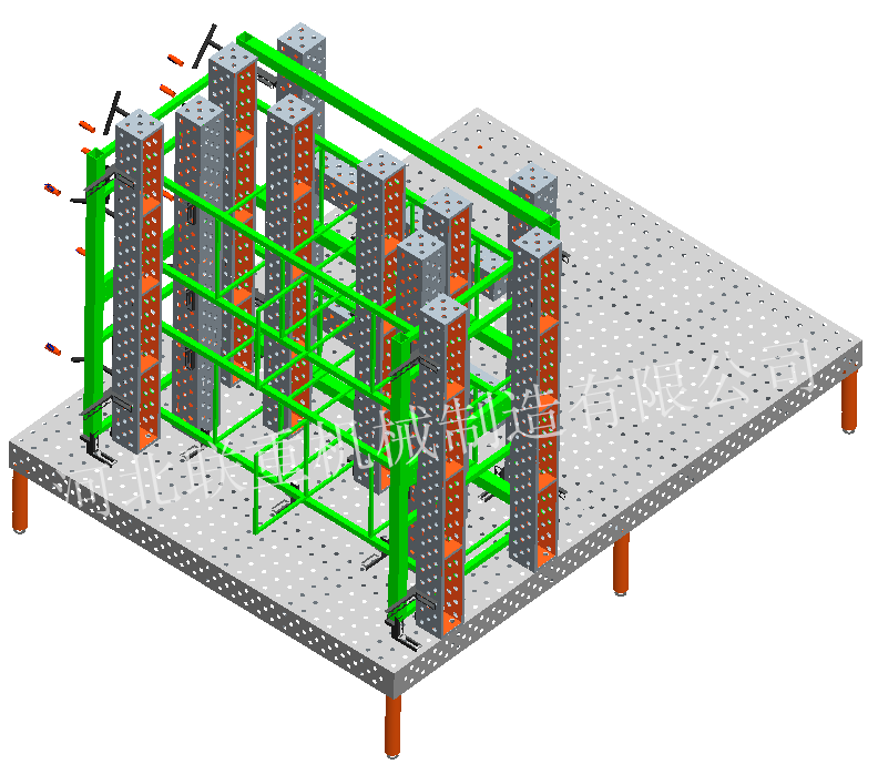三維:代表三個方向一般夾具都是縱向和橫向沒有垂直方向。三維焊接平臺大面有二個方向,四周邊可用作垂直方向的安裝,從而達到立體組合。
