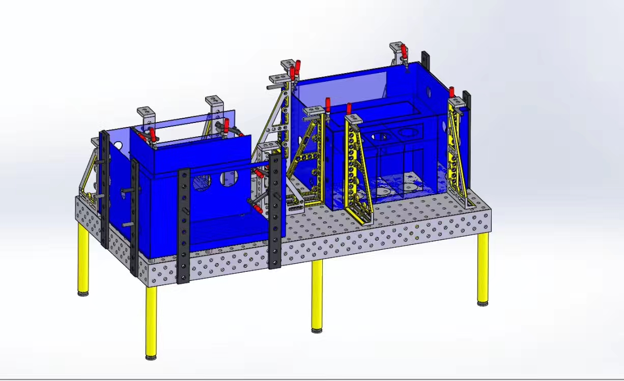 2、柔性化:柔性三維組合焊接工裝平臺(tái)的承載能力高,鋼性穩(wěn)定,它的五個(gè)面均加工有規(guī)則的孔,并刻有網(wǎng)線。焊接平臺(tái)可方便地延伸和擴(kuò)展,組合。經(jīng)擴(kuò)展的標(biāo)準(zhǔn)臺(tái)面可模塊化的定位和夾緊直接連接在一起。在安裝、調(diào)整和定位工件過程將柔性三維組合焊接工裝系統(tǒng)的通用功能展示的,尤其在了大型工件方面的應(yīng)用上。拼裝方式多樣,用戶只要充分發(fā)揮想象力,幾乎可達(dá)到任何夾具同樣的定位和夾緊功能。拼裝,裝拆方便;工作臺(tái)面可以根據(jù)工件形狀、大小進(jìn)行拼裝組合。臺(tái)面上的刻度和模塊尺寸的設(shè)計(jì),使操作工人不用量具就可以根據(jù)工件尺寸搭出所需要的工裝。